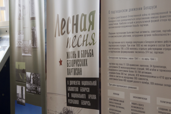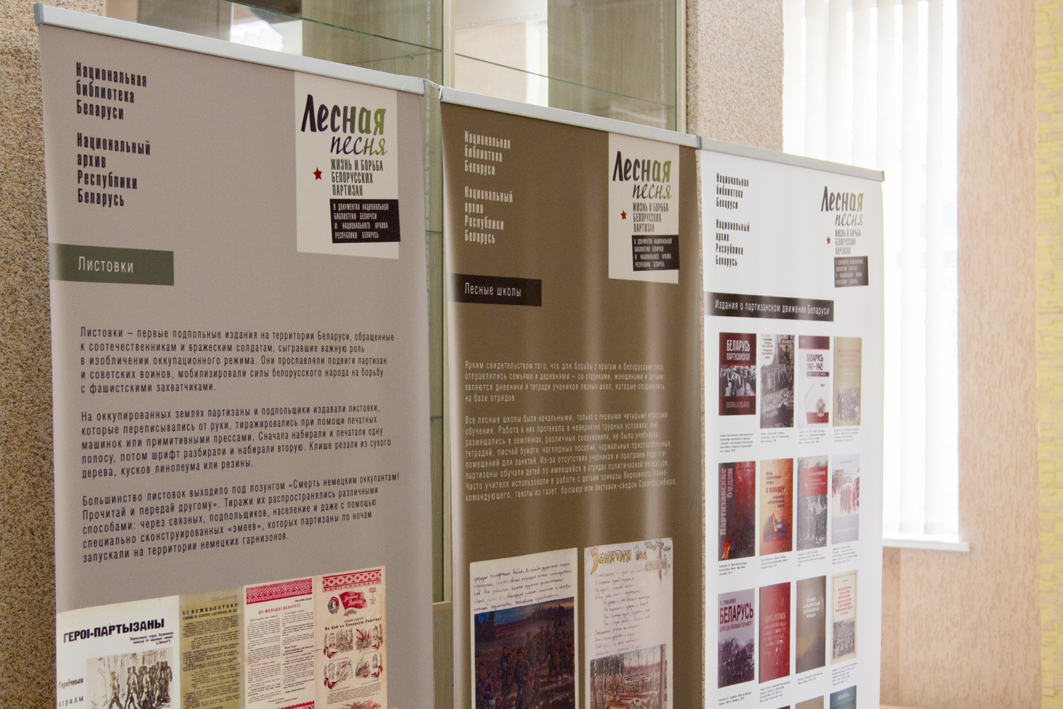 Экспозиция «Лесная песня» иллюстрирует жизнь и борьбу белорусских партизан. В этой части выставки представлены документы Национальной библиотеки Беларуси и Национального архива республики. Здесь можно увидеть партизанские рукописные журналы, листовки, газеты и плакаты тех лет.