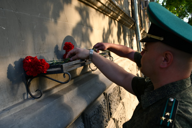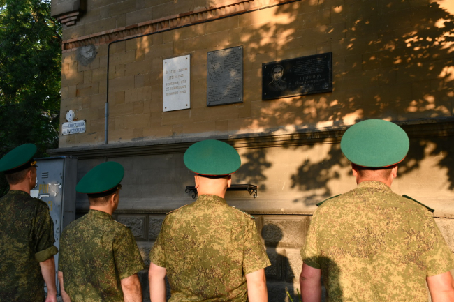 К мемориальной доске у здания штаба 25-го погранотряда, дислоцировавшегося до 1940 года в Тирасполе, возложили цветы