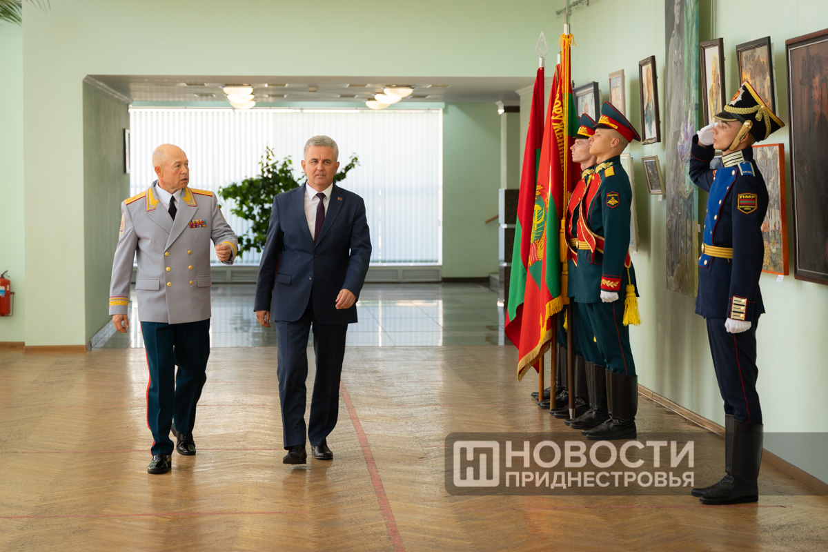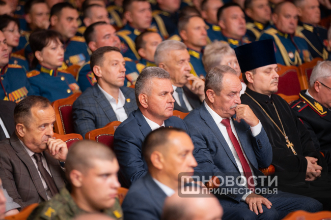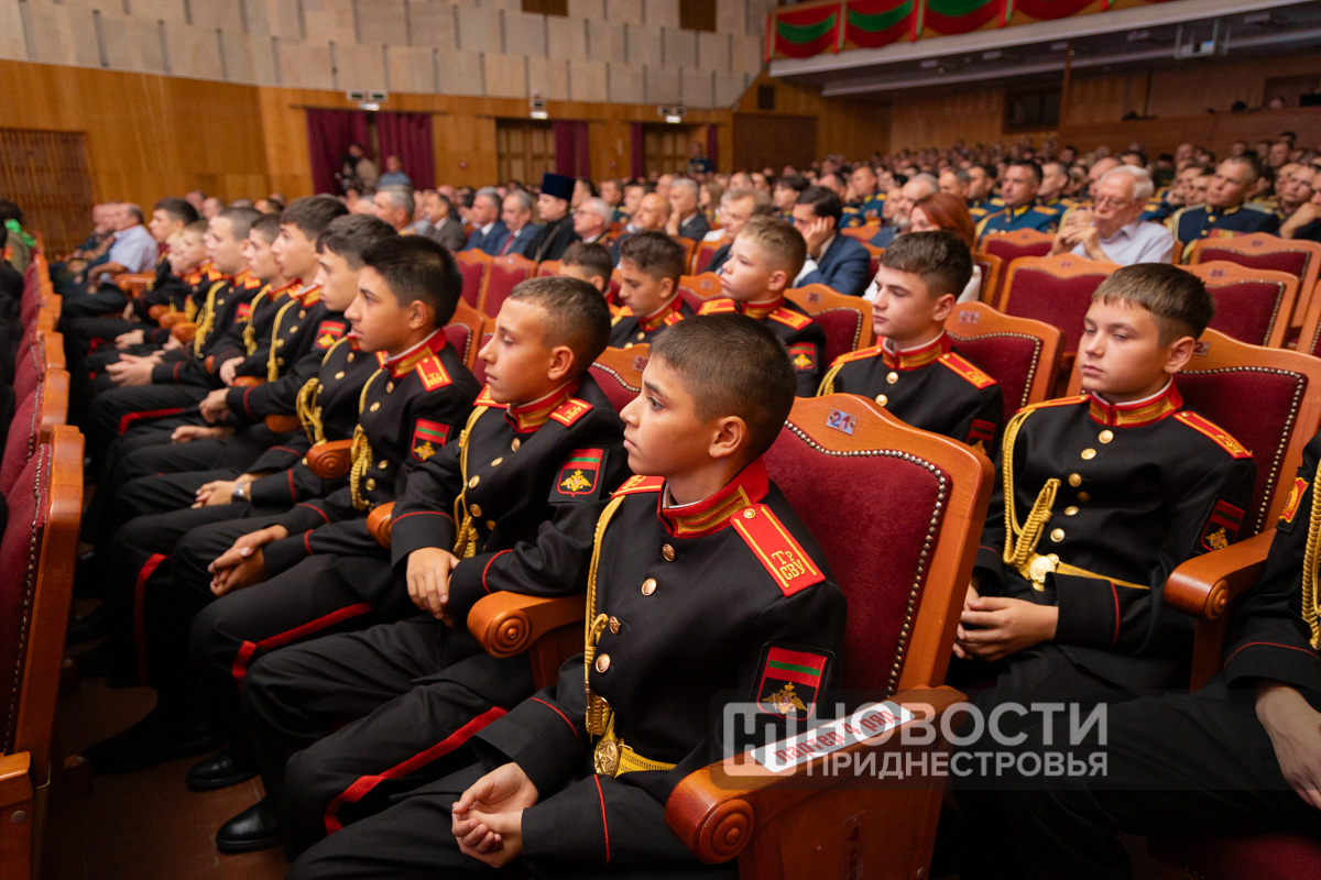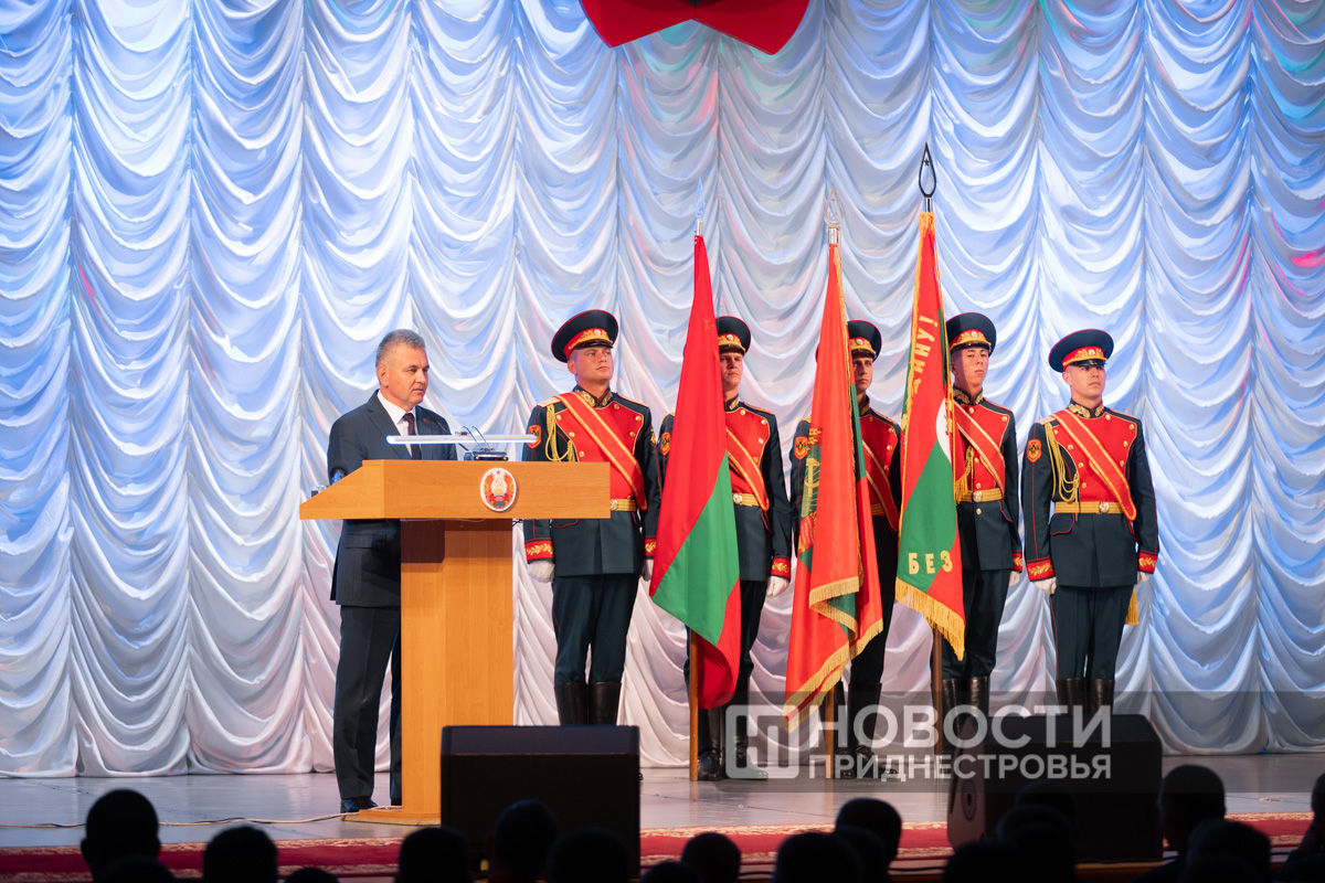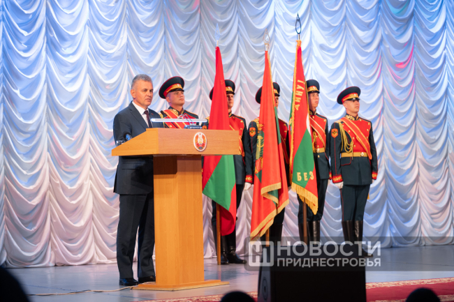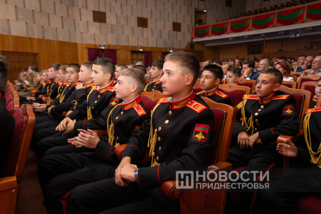 Президент ПМР Вадим Красносельский поздравил собравшихся с юбилеем приднестровской государственности и 34-й годовщиной создания Вооружённых сил ПМР. Президент напомнил о героизме предков, которые в разные периоды становились на защиту родной земли, а также отметил важность будущего поколения защитников - суворовцев и курсантов Военного института.