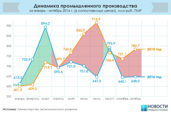 Ситуация в индустриальном секторе республики в текущем году складывается в условиях падения параметров внешнеэкономической деятельности, а также сужения спроса на внутреннем потребительском рынке в совокупности с продолжающимся воздействием внешнеполитических и экономических барьеров в отношении хозяйствующих субъектов со стороны соседних государств. По данным Минэкономразвития, объем промышленного производства (без учета субъектов малого предпринимательства) в январе-октябре 2016 года составил 6 337,2 млн руб. (в текущих ценах), сократившись на 11,4%. В сопоставимых ценах данный показатель сложился на 4,9% ниже базового уровня минувшего года, при этом в долларовом эквиваленте объем произведенной продукции составил 563,4 млн долл. или 87,4% к уровню аналогичного показателя 2015 года.