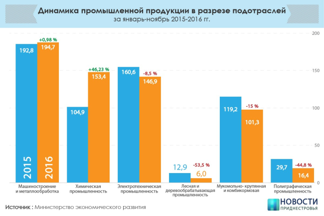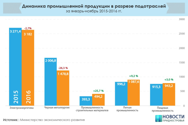 В целом же если не учитывать производственные показатели бюджетообразующих предприятий: ЗАО «Молдавская ГРЭС» и ОАО «Молдавский металлургический завод», наблюдается прирост объёма производства по отношению к соответствующему периоду 2015 года на 6,8%.
