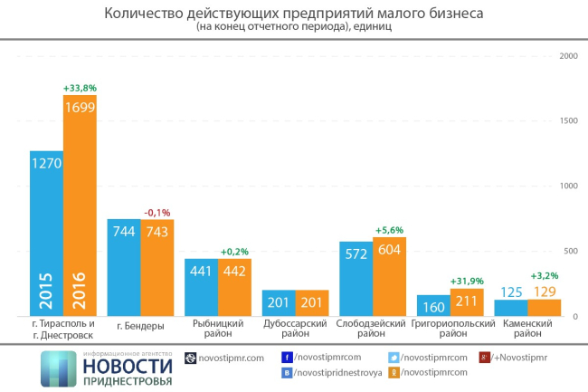 По региональному распределению наибольшее количество субъектов малого предпринимательства в январе-марте 2016 года сосредоточено в г. Тирасполь и г. Днестровск — 1 699 ед. (42,2% от общего количества по республике), в г. Бендеры — 743 ед. (18,4%) и в Слободзейском районе и г. Слободзея — 604 ед. (15,0%) соответственно. Наименьшее количество субъектов малого предпринимательства отмечается в Каменском районе и г. Каменка (3,2% или 129 ед.).