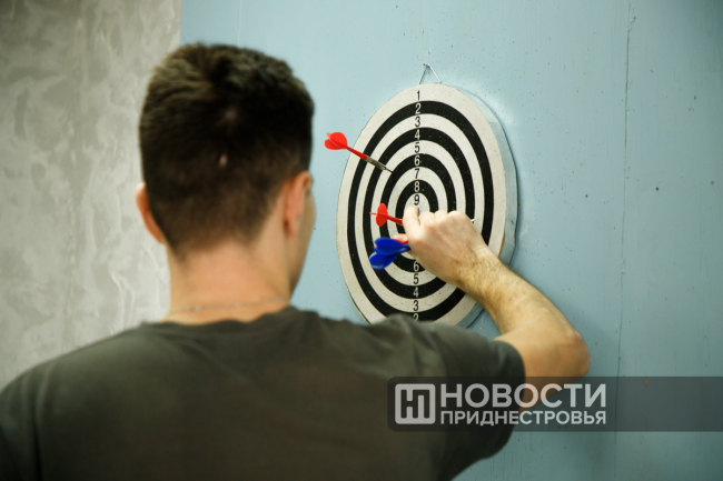 Сегодня здесь организовали соревнования по настольному теннису и игре в дартс. А вчера участники испытывали внимательность и память в состязании по шахматам и шашкам.
