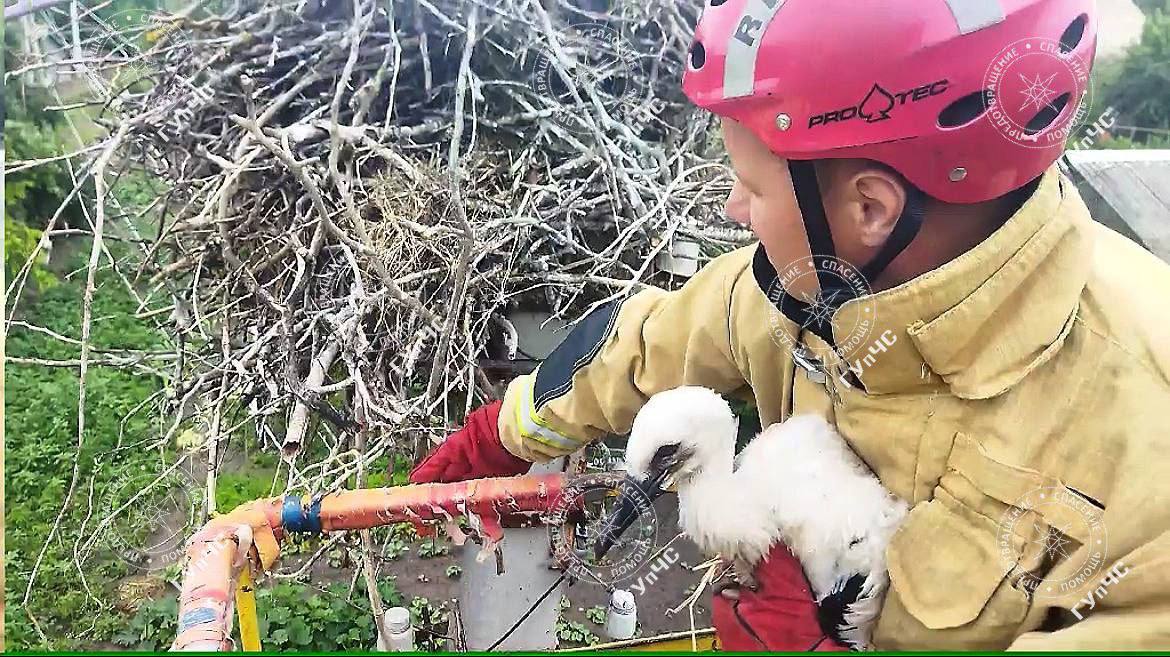 Сегодня аистёнка подняли в гнездо на специальной вышке (её предоставили электросети). Спасатели осторожно, чтобы не задеть линии электропередач, посадили птенца в гнездо, сообщает пресс-центр МВД ПМР.