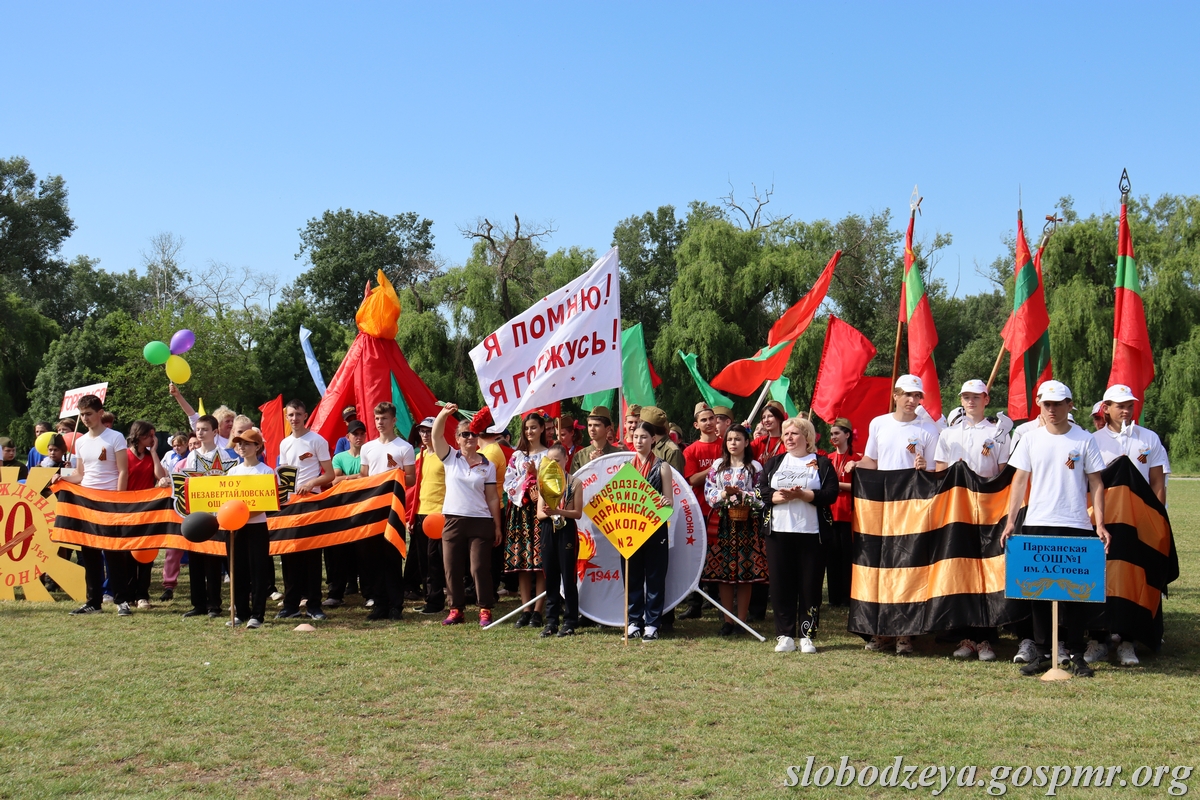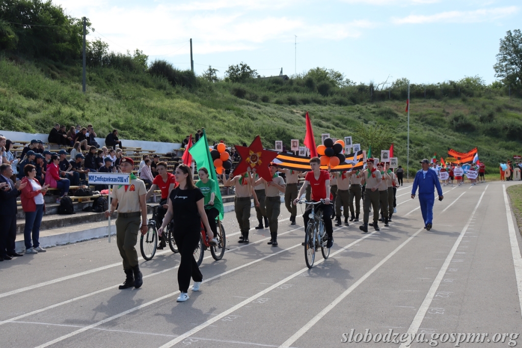 Праздничную атмосферу создавали образцовый танцевальный ансамбль «Ритмик-данс» и солисты районного Дома культуры. Праздник продолжило торжественное шествие представителей организаций образования Слободзейского района. В этом году оформление колонн было посвящено теме 80-летия освобождения района от немецко-румынских захватчиков. Большие георгиевские ленты, красные звёзды, импровизированные Вечный огонь, медали и ордена, портреты дедов и прадедов – всё это было в арсенале участников мероприятия.