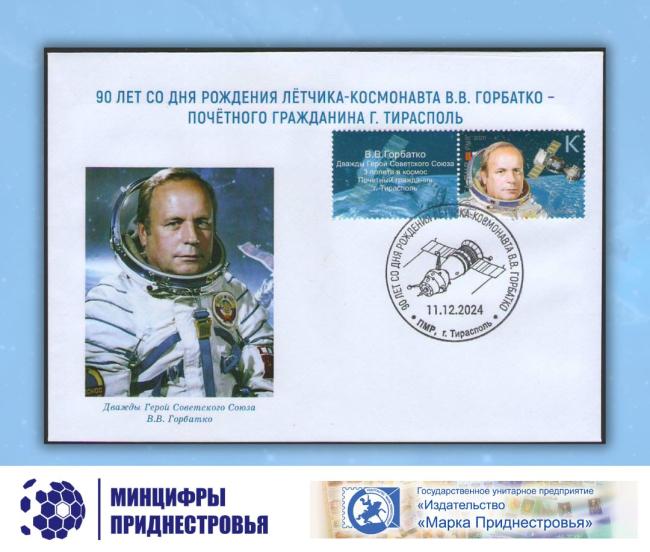 Тирасполь, 10 декабря. /Новости Приднестровья/. 11 декабря в столичном офисе Издательства «Марка Приднестровья» состоится спецгашение памятного конверта «90 лет со дня рождения летчика-космонавта В. В. Горбатко - почётного гражданина г. Тирасполь».