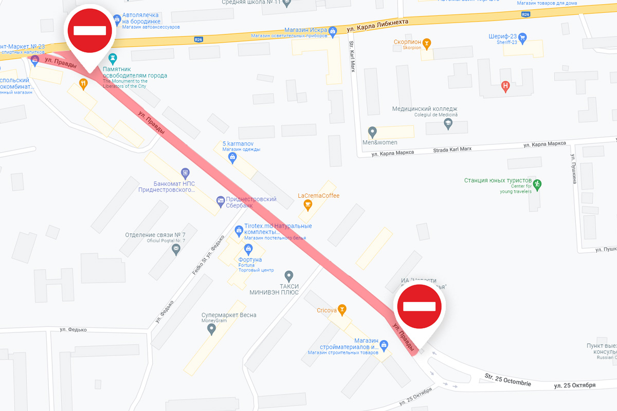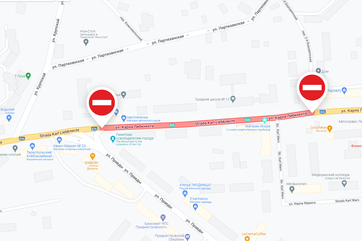 Тирасполь, 30 марта. /Новости Приднестровья/. В Тирасполе в апреле будут перекрыты несколько улиц. Так, с 4 по 7 апреля для движения автотранспорта полностью закроют ул. К. Либкнехта от 2-го Бородинского переулка до ул. Правды.