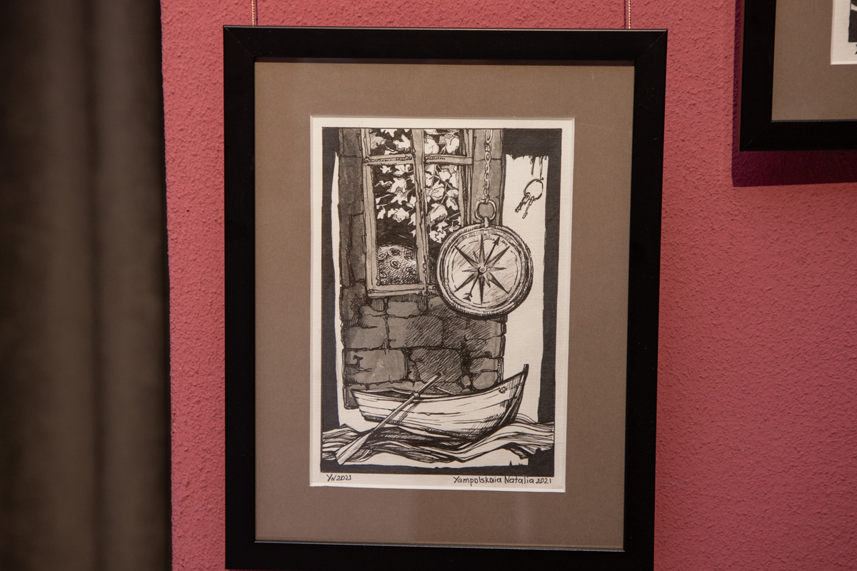 В первом зале можно увидеть «Лабиринты отражений» Натальи Ямпольской. Участница и куратор многих международных арт-проектов представила более 50-ти произведений живописи, оригинальной графики, а также работы декоративно-прикладного творчества. Яркие и сочные, они будто переносят в другую реальность. Прослеживаются и национальные мотивы.