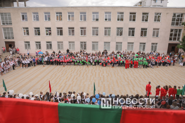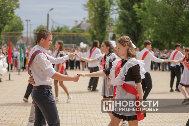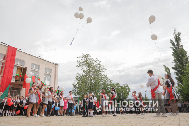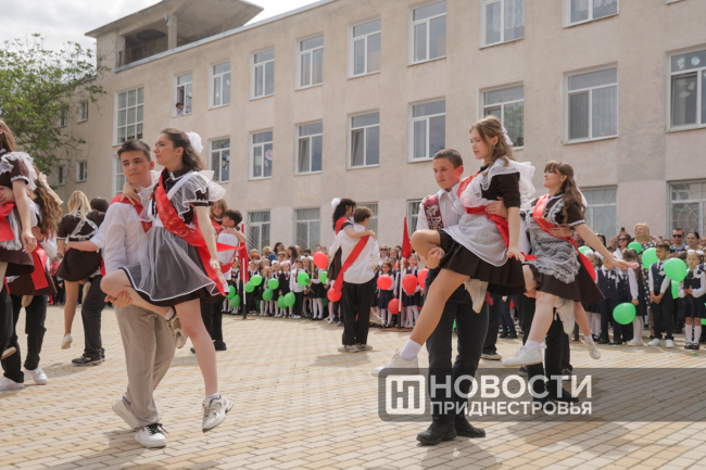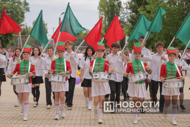 Программа Последнего звонка там, как всегда, насыщенная. Флаг Приднестровья на здании школы развернули скалолазы, праздничное выступление подготовили барабанщицы. Выпускники передали символический Огонь знаний ученикам родной школы.