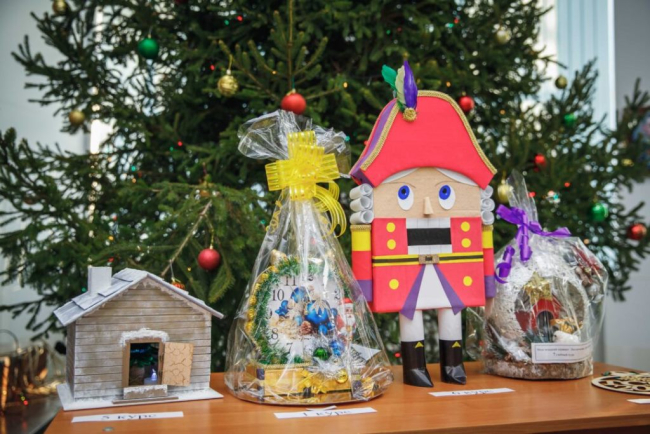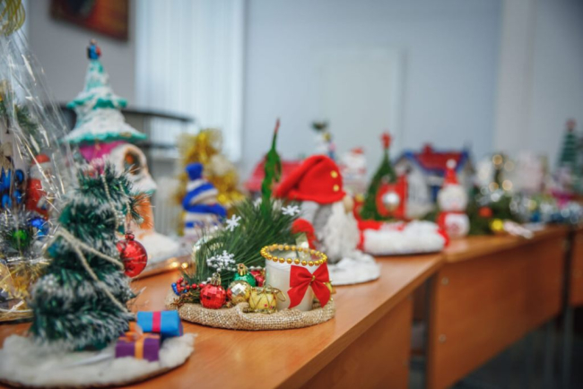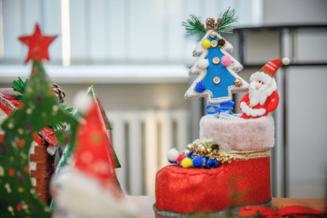 На суд комиссии были предложены декоративные часы, украшенные сладостями; композиции, декорированные еловыми ветвями и елочными игрушками; подвески на ёлку, вырезанные из дерева; светодиодные домики.