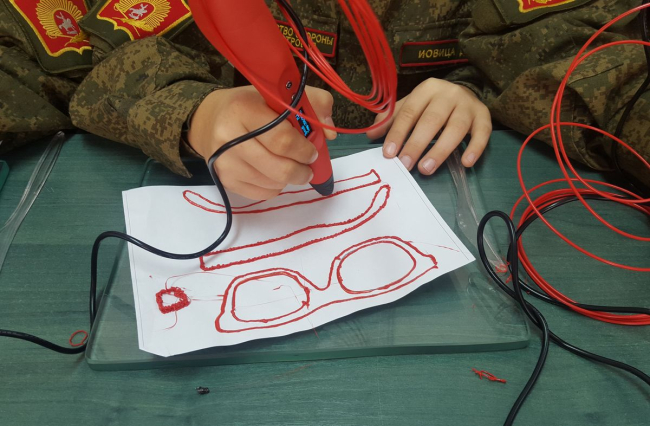 Суворовцам предстояло самостоятельно нарисовать себе очки, для этого каждому раздали необходимые для этого предметы и рассказали о принципе работы «горячей» 3D ручки. А он предельно прост. В отличие от обычных приспособлений для письма и рисования, вместо чернил заправляется экологически чистая пластиковая нить, которая выдавливается в расплавленном виде наружу. Металлический наконечник печатной головки нагревается в среднем до температуры 240 °С, поэтому при работе с устройством следует придерживаться базовых правил безопасности и не хвататься пальцами за сопло во время работы с прибором. В остальном ручка абсолютно безопасна, отмечают специалисты.