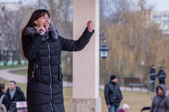В Тирасполе праздник продолжился концертом заслуженного муниципального ансамбля народной музыки и танца «Ватра». Выступали артисты на сцене Екатерининского парка в центре столицы. Программу открыла солистка ансамбля Сильвия Осипова. Девушка исполнила три композиции на молдавском языке. Артистка рассказала, о чём её песни.