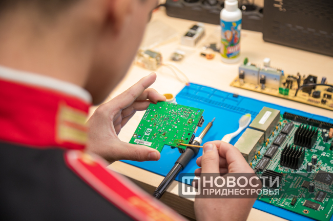 «Это материнская плата. Если нам нужно заменить какую-то неисправную деталь, мы сначала её мажем флюс-пастой, а потом начинаем отпаивать и двигать, она будет потихоньку отходить. Для меня это уже второе занятие, интересно тем, что можно выбрать разные направления и по очереди ими заниматься. Я вот ещё пробовал роботов собирать», – поделился впечатлениями один из ребят.