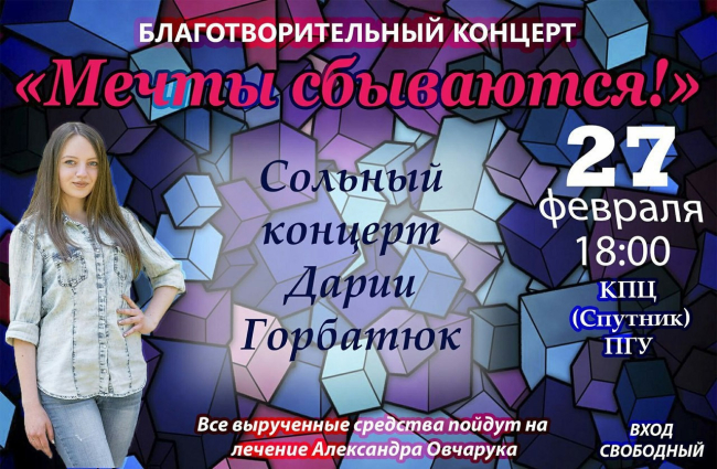 Сбор средств, жизненно необходимых для Саши, состоится уже завтра на входе в культурно-просветительский центр ПГУ. С сольным концертом в поддержку ребёнка выступит вокалистка Дария Горбатюк.