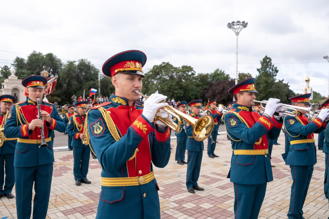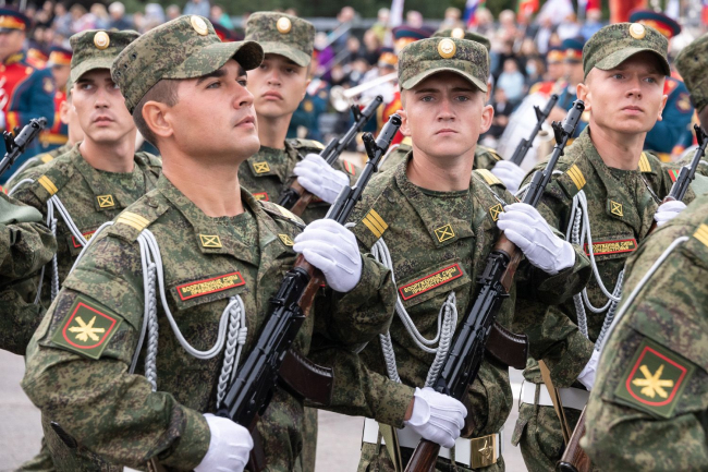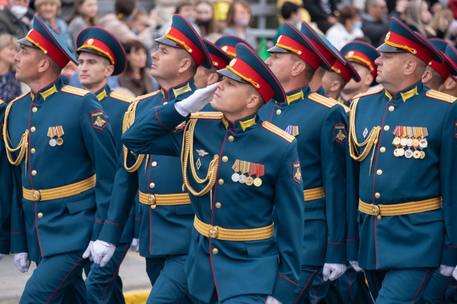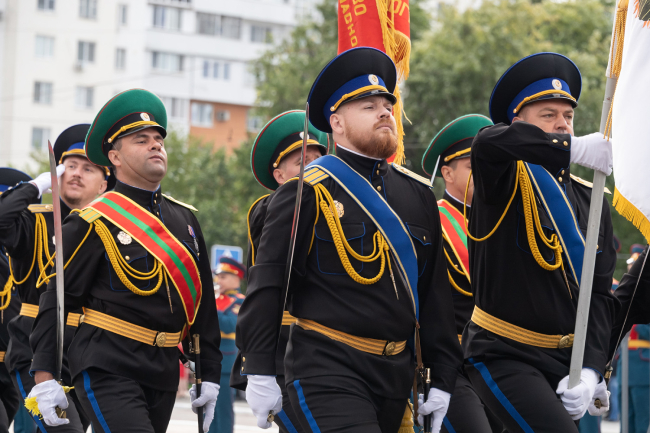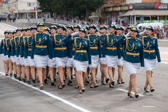 И вновь над площадью прозвучала команда: «Парад, смирно! К торжественному маршу!» По традиции прохождение войск открыли воспитанники Республиканского кадетского корпуса во главе с начальником, майором милиции Николаем Ганевичем. Следом за ними по главной площади республики отчеканили шаг суворовцы, офицеры Министерства обороны, курсанты Военного института, воины-мотострелки, авиаторы, артиллеристы, бойцы Отряда специального назначения, миротворцы, парадные расчеты Министерства внутренних дел, Пограничного управления МГБ ПМР, Черноморского казачьего войска и конвойного батальона Министерства юстиции. Отдельный парадный расчет составили представительницы прекрасной половины Вооруженных сил во главе с майором Ириной Филиппович.