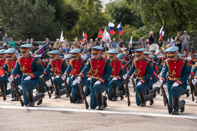 По окончании торжественного прохождения войск блестящее выполнение строевых приемов продемонстрировали в ходе плац-парада 36 военослужащих роты Почетного караула Министерства обороны ПМР под командованием старшего лейтенанта Евгения Андреева.