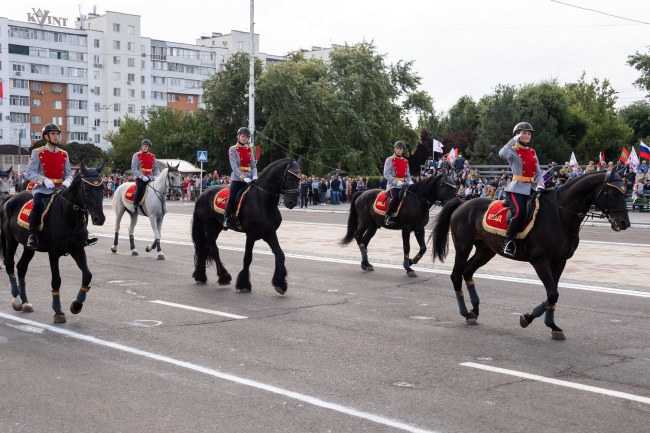 На площади их сменил конный парадный расчет во главе с командиром роты служебного коневодства и собаководства Специального отряда быстрого реагирования «Днестр», главным тренером МВД ПМР по конному спорту старшим лейтенантом милиции Анастасией Кудлюк. 19 всадников на лошадях различных пород, в том числе знаменитых орловских рысаках, продемонстрировали зрителям виртуозное мастерство выездки.