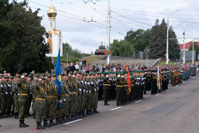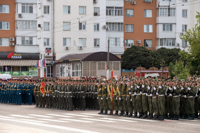 К девяти часам утра на площади выстроились 18 парадных расчетов общей численностью около 1300 человек. Здесь были представлены все силовые структуры Приднестровья. В строю стояли как юные кадеты и суворовцы, так и ветераны, защищавшие республику в 1992 году.