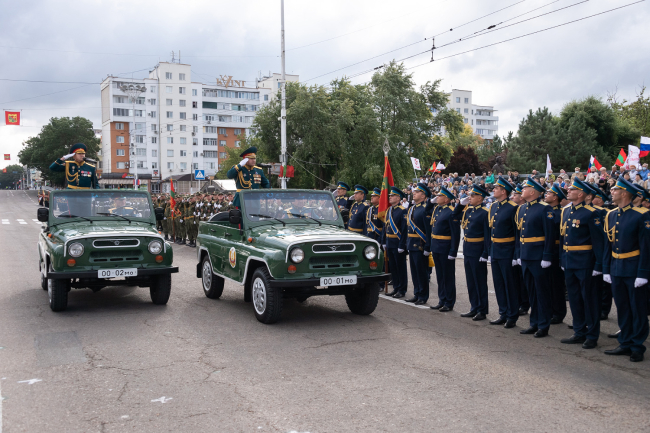 Командовавший парадом начальник Главного штаба Вооруженных сил генерал-майор Павел Михайлов отдал рапорт принимавшему парад министру обороны Приднестровской Молдавкой Республики генерал-майору Олегу Обручкову. Объехав выстроенные на площади парадные расчеты и поздравив их с праздником, руководитель военного ведомства доложил Главнокомандующему Вадиму Красносельскому о готовности войск к параду.