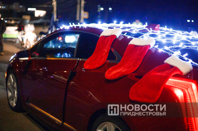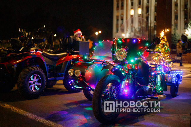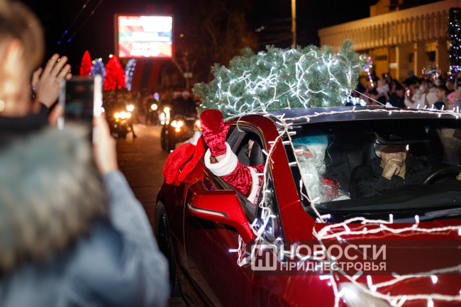 В этом году Дед Мороз и Снегурочка приехали на двух красных кадиллаках, украшенных гирляндами, в сопровождении байкеров клубов «Медведи», «Пять ветров» и других.