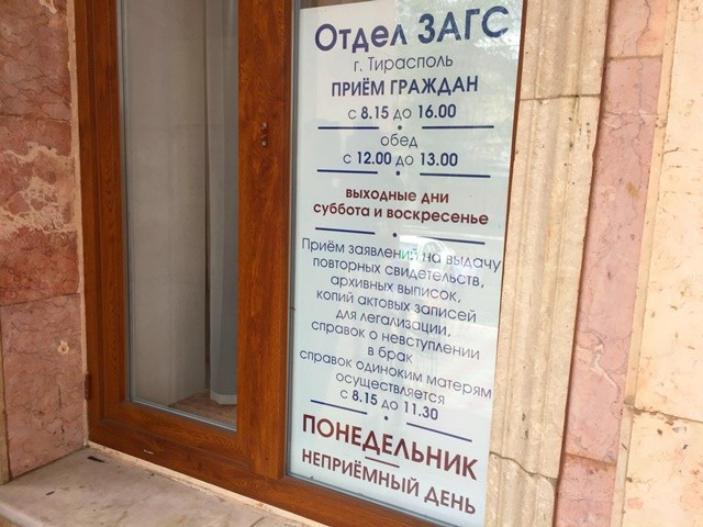 Тирасполь, 28 июля. /Новости Приднестровья/. В отделе ЗАГС государственной администрации Тирасполя и Днестровска начала работу служба «Одно окно». Дворец торжественных обрядов в столице располагается по адресу ул. Луначарского, 26.