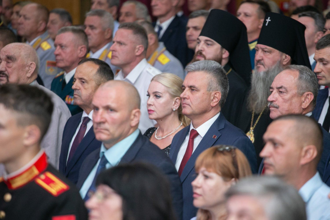 «Уважаемый первый Президент Приднестровской Молдавской Республики Игорь Николаевич Смирнов, уважаемые ветераны, основатели и защитники Приднестровья, Ваше высокопреосвященство уважаемый Владыка Савва, дорогие приднестровцы. Поздравляю вас с 35-й годовщиной образования Приднестровской Молдавской Республики.