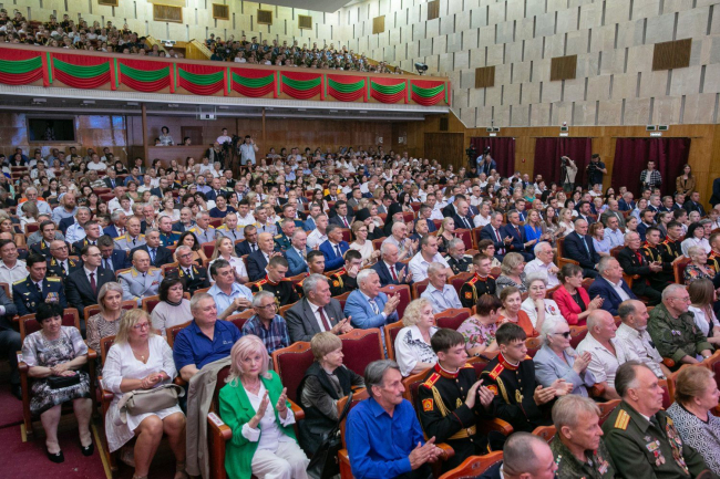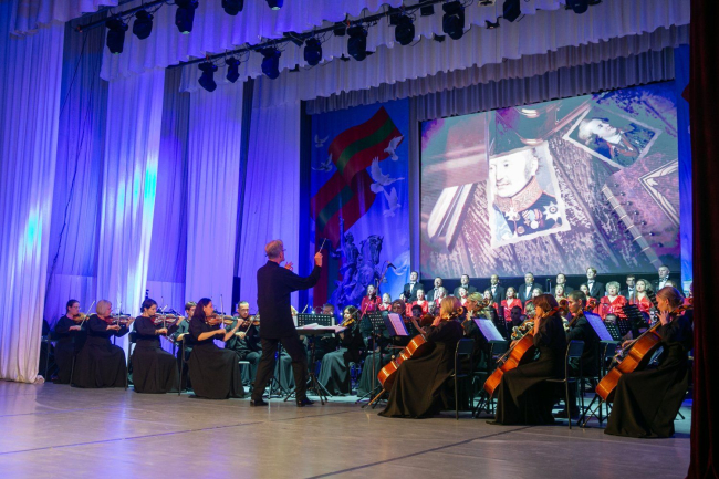 Торжественное собрание завершилось выносом государственных флагов и штандарта Президента ПМР. Начался праздничный концерт.