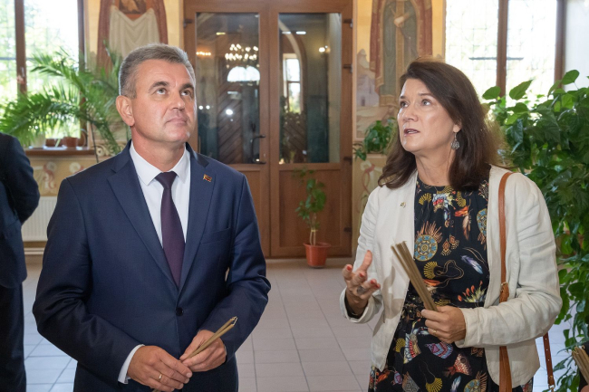 Бендеры, 6 октября. /Новости Приднестровья/. По завершении основной части встречи Президента ПМР Вадима Красносельского с делегацией, возглавляемой Действующим председателем ОБСЕ Анн Линде, гостям было предложено совершить прогулку по парку Александра Невского. Члены европейской делегации посетили одноименный храм. Вадим Красносельский, инициатор восстановления церкви Александра Невского на ее историческом месте, познакомил собеседников с историей храма, остановился на значимости личности великого русского полководца, причисленного к лику святых. Президент ПМР рассказал, что после долгих лет гонений на церковь в прошлом столетии на территории современного Приднестровья функционировало всего четыре православных храма. На сегодняшний день их количество выросло до 140. Анн Линде отметила качество реставрационных работ, а также подчеркнула особую атмосферу, царящую в храме Александра Невского, говорится в сообщении президентской пресс-службы.