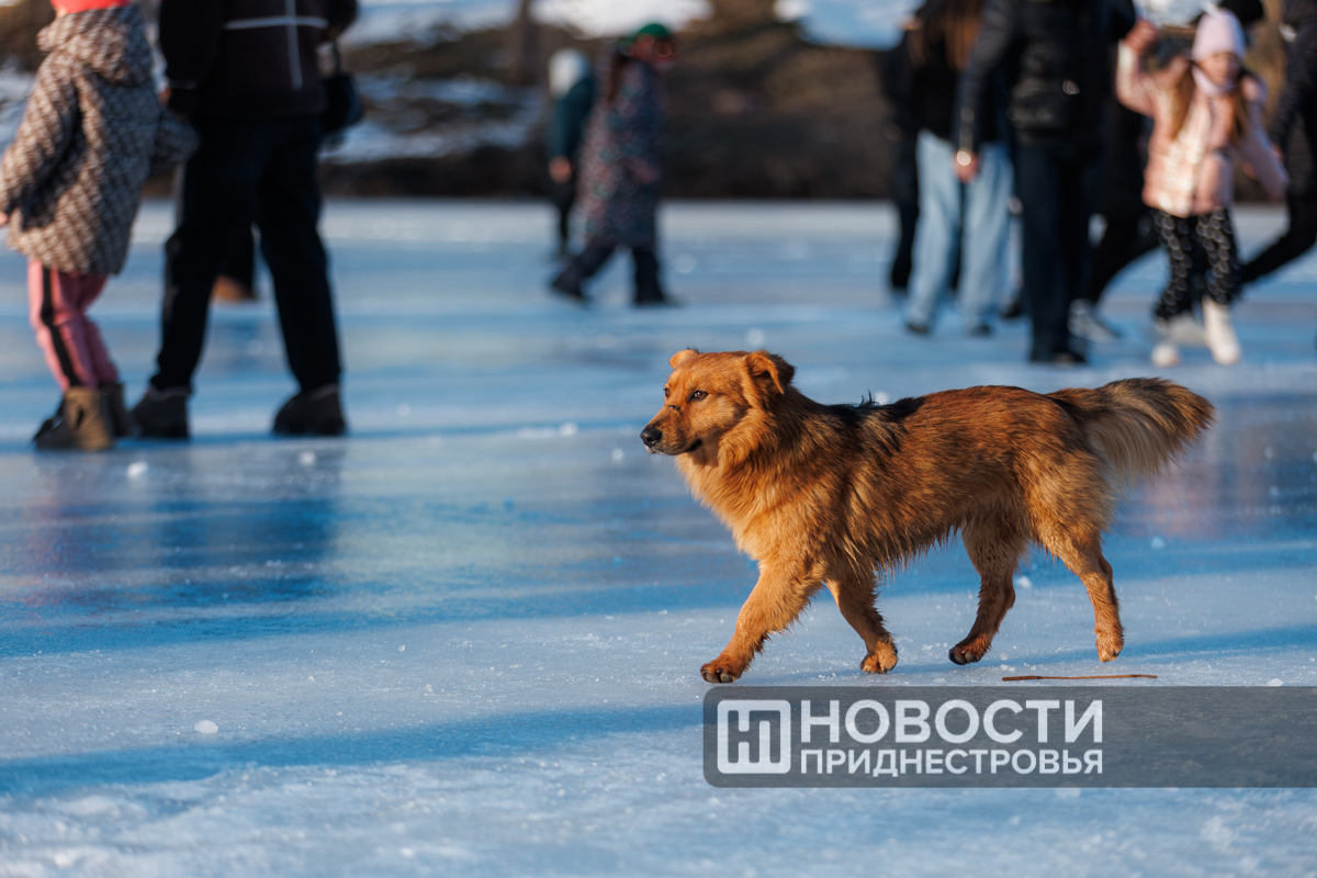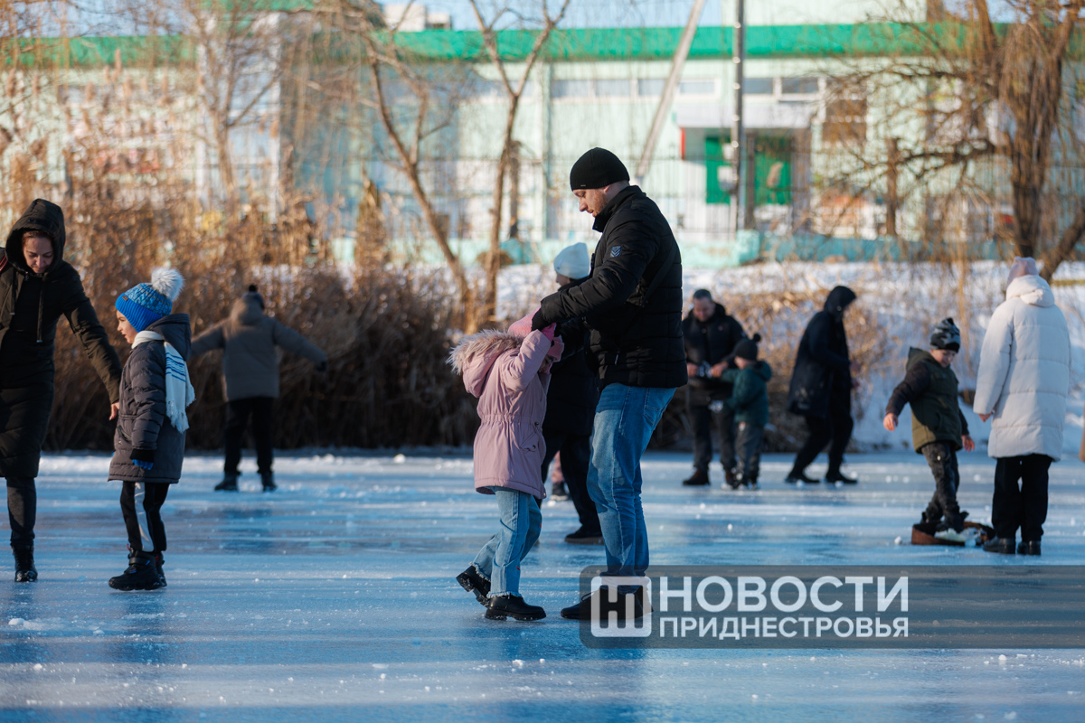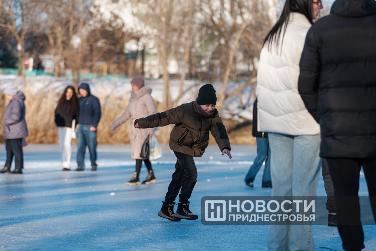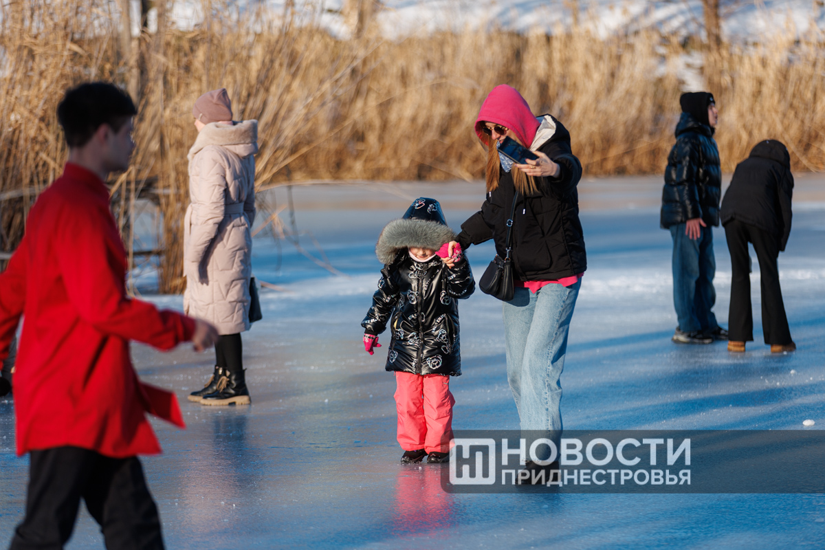 В парке было довольно шумно: дети вовсю играли в снежки и лепили снежную бабу. Это и неудивительно, ведь нынешняя зима выдалась для Приднестровья особенно морозной. Настолько, что десятки людей смогли сегодня покататься по льду замёрзшего озера.