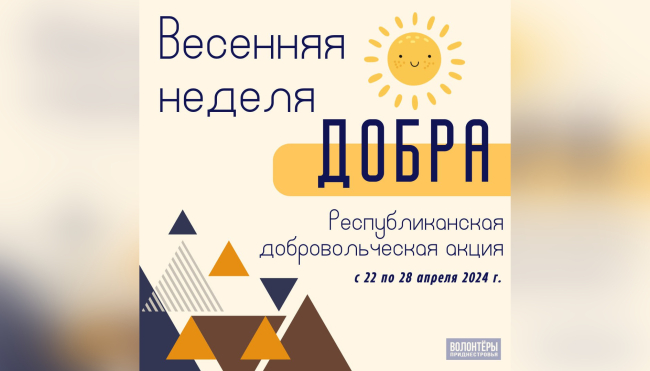 Тирасполь, 22 апреля. /Новости Приднестровья/. Экологическое добровольчество, донорство, популяризация здорового образа жизни, помощь нуждающимся людям, а также бездомным животным – всё это «Весенняя неделя добра». Республиканская добровольческая акция под этим названием стартовала в Приднестровье и продлится до 28 апреля. Организатором выступает Министерство просвещения ПМР.