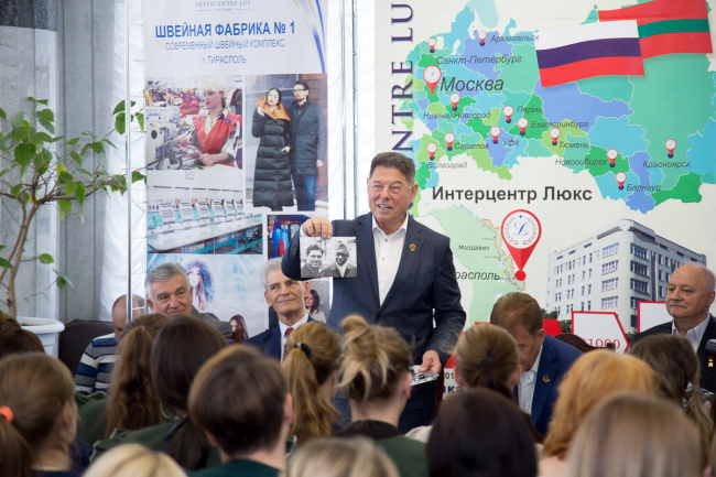 Приглашенные на встречу гости – Олег Баев, Георгий Желяпов, Александр Карасев, Виктор Костырко, Владимир Никифоренко и Владимир Ладункин во главе с Анатолием Дзерновичем ознакомились с производством предприятия, а затем поделились с коллективом швейной фабрики воспоминаниями комсомольских времен.