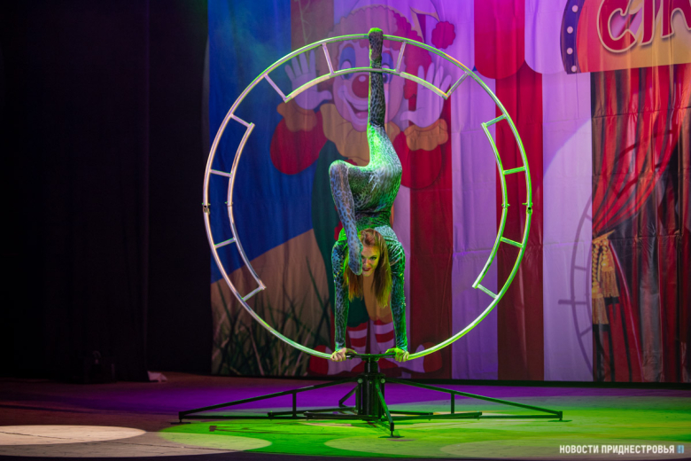 С дебютным номером на партерном кольце выступила гимнастка цирка. На вращающемся снаряде она исполнила различные трюки.