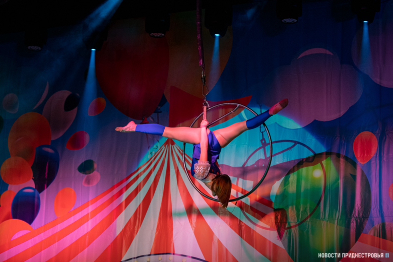 Детей ожидала большая развлекательная программа, которую открыла юная циркачка. Она исполнила гимнастический номер на полотнах. Находясь почти под самым потолком, девочка показала различные завораживающие гимнастические трюки.