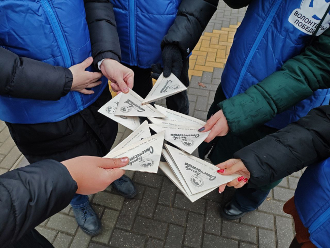 На улицах, названных в честь героев Отечества, они раздавали сложенные в виде фронтового письма-треугольника листовки с биографиями этих героев.