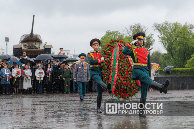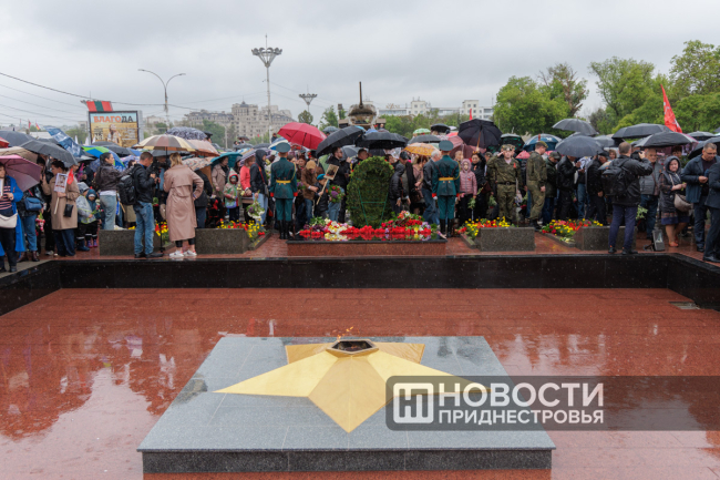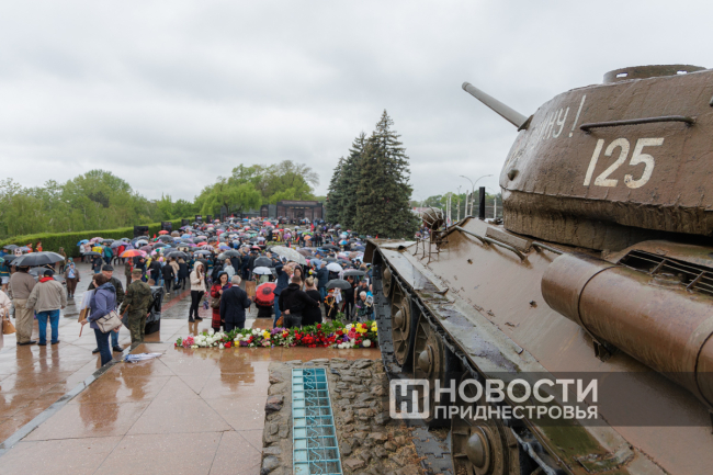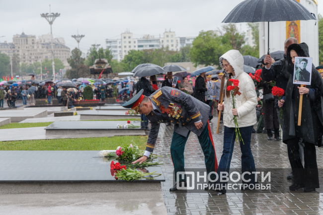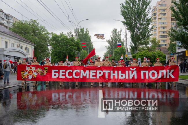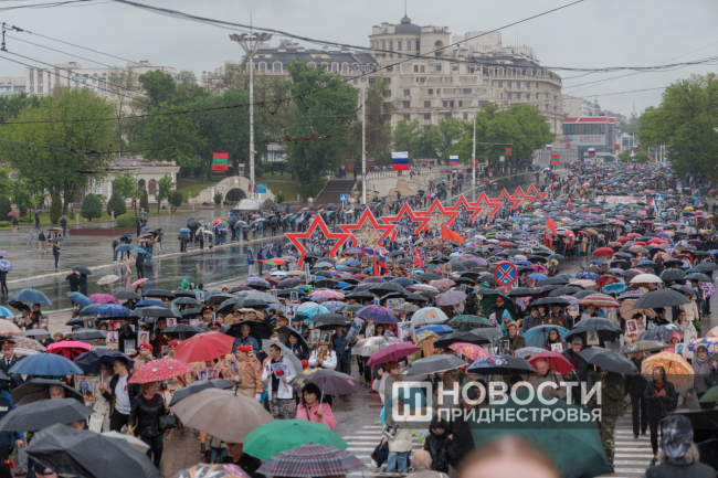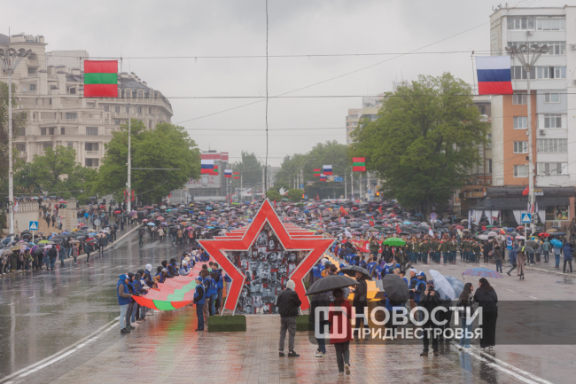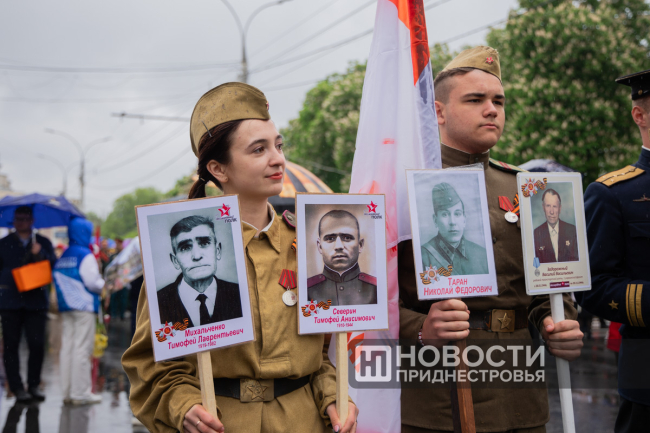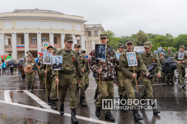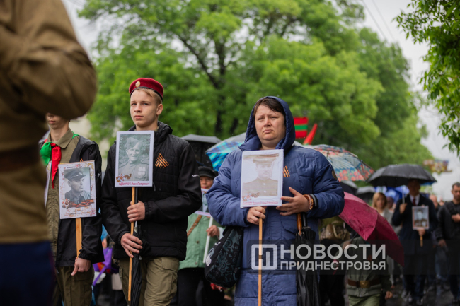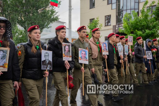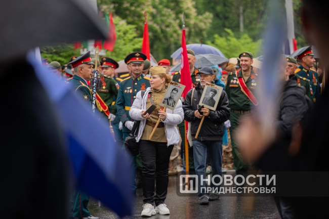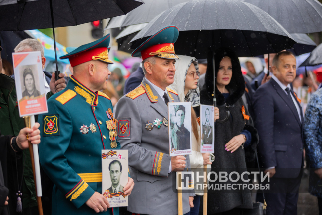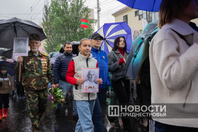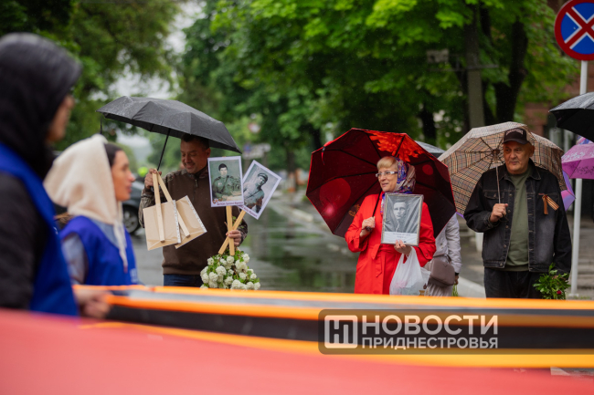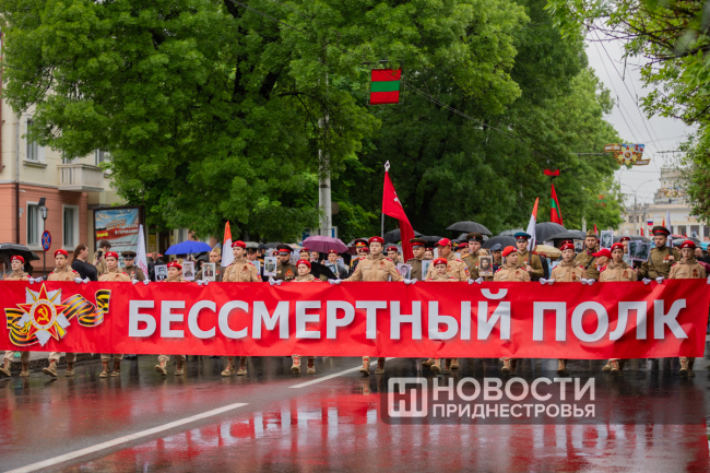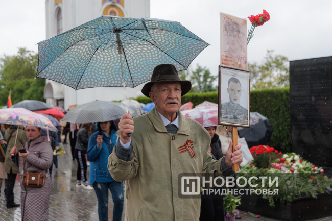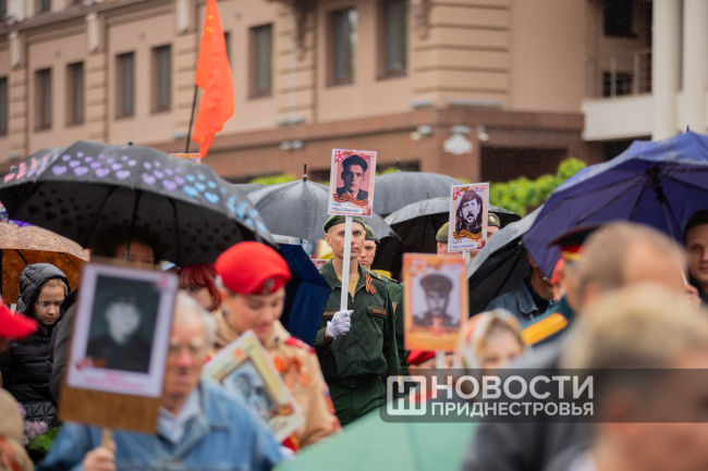 Тирасполь, 9 мая. /Новости Приднестровья/. «Бессмертный полк» вновь прошёл по улицам Тирасполя после перерыва в пять лет. Несмотря на проливной дождь, в шествии приняли участие порядка 35 тысяч человек.