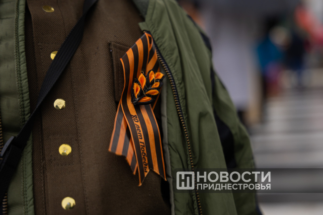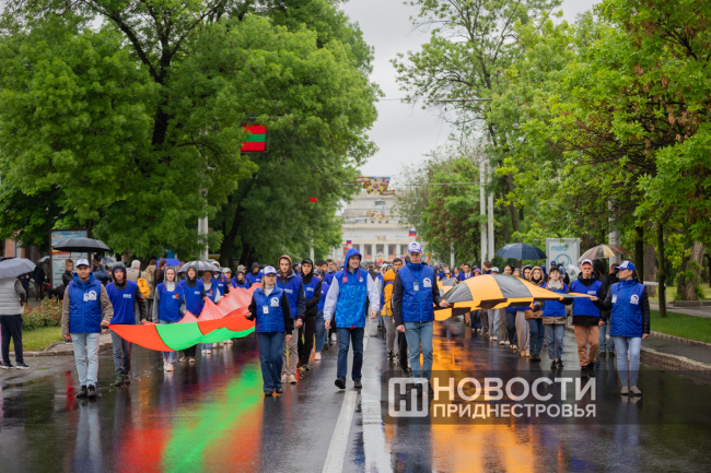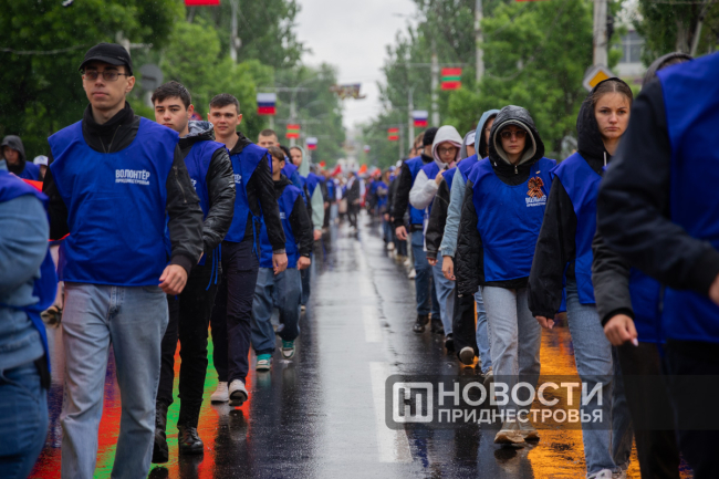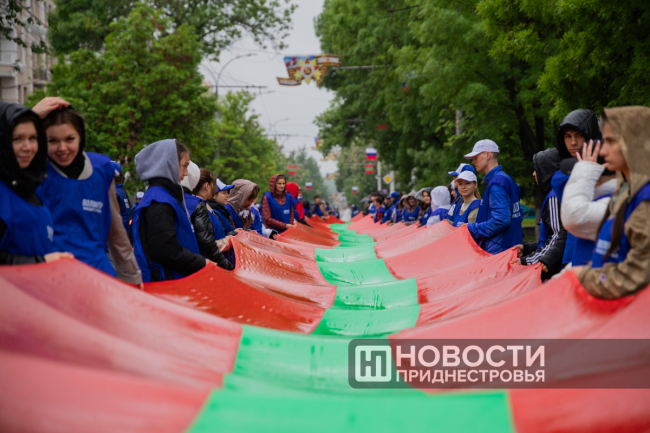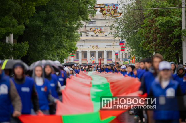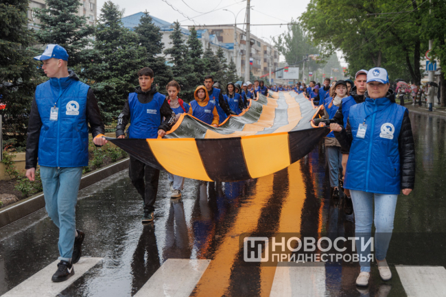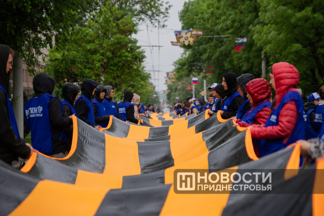 Студенты Приднестровского госуниверситета и «Волонтёры Победы» несли два огромных полотна длиной по 100 метров — одно в цветах Государственного флага ПМР, другое — в виде Георгиевской ленты.