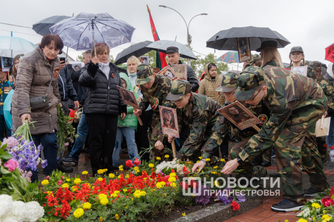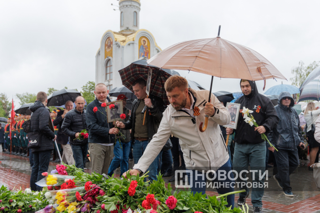 На протяжении всего дня на мемориал приходили люди, возлагали цветы, приносили портреты своих родных и вспоминали историю героического подвига многонационального советского народа.