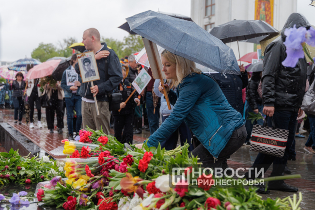 Завершилось шествие на Мемориале Славы. После минуты молчания в знак памяти и признательности за великую Победу к Вечному огню легла россыпь цветов.