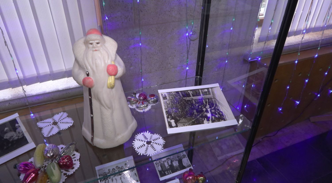 Есть в экспозиции и раритетные новогодние открытки, много чёрно-белых фотографий из музейного архива. На одной из них дети в новогодних костюмах водят хороводы вокруг ёлки во Дворце культуры имени Ткаченко полвека назад, тогда городской ДК только построили.