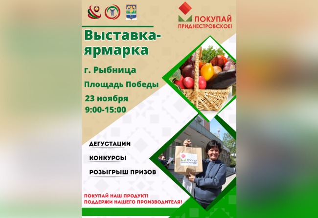Тирасполь, 21 ноября. /Новости Приднестровья/. В субботу, 23 ноября, на площади Победы в Рыбнице пройдет выставка-ярмарка в рамках проекта «Покупай приднестровское!». Как отмечает пресс-служба Торгово-промышленной палаты ПМР, в ней примут участие производители со всей республики, чтобы представить приднестровскую продукцию и порадовать жителей и гостей города.