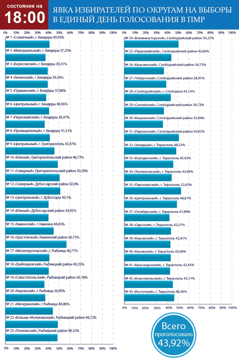 Тирасполь, 29 ноября./ИА «Новости Приднестровья»/. По данным Центризбиркома ПМР на 18:00 общая явка на выборах в Верховный и местные советы всех уровней, а также глав сельских и поселковых администраций составила 43,92%.
