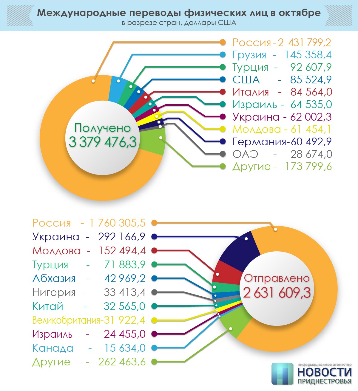 Примечательно, что в географии внешних переводов лидером также является Россия, правда, здесь показатели чуть меньше – 67%. Помимо неё, жители Приднестровья отсылали деньги на Украину (11% от общего объёма) и в Молдову (5,8%), а ещё в Турцию, Абхазию, Китай, Израиль, Великобританию, Канаду и даже Нигерию.