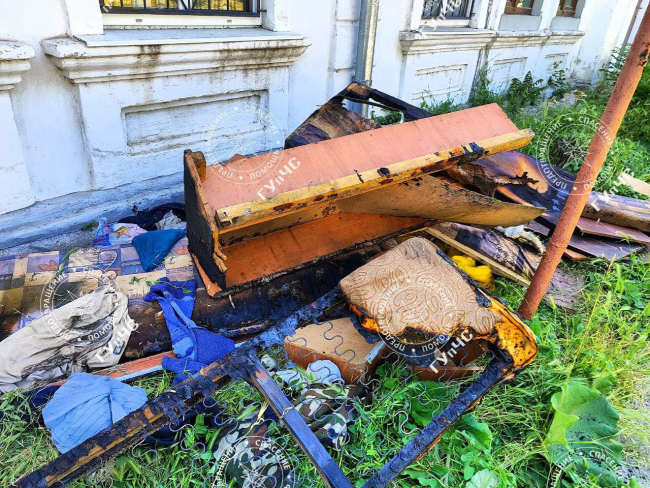 В одной из комнат горели диван, кресло и тумбочки. Пожарные сбили пламя, сгоревшую мебель пролили и вытащили на улицу.
