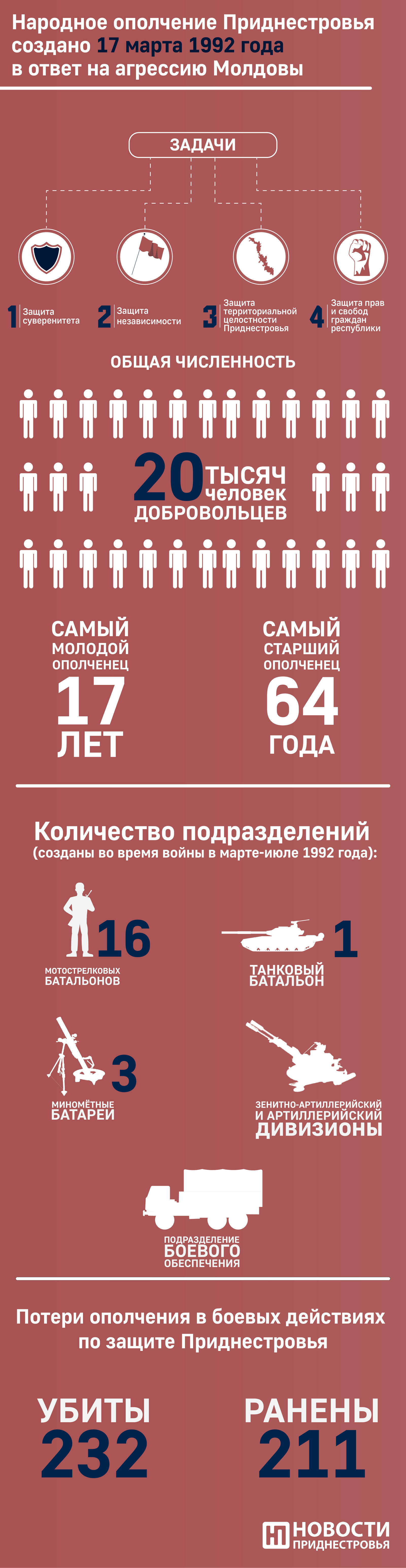 Напомним, что это временное вооружённое формирование было создано 17 марта 1992 года Указом Президента ПМР для защиты молодой республики от агрессии Молдовы. Первыми в ополчение перешли около 10 тысяч человек из рабочих отрядов содействия милиции, сформированных на приднестровских предприятиях ещё в 1990 году. В дальнейшем в него вступили тысячи добровольцев со всего Приднестровья. В 2019 году по Указу Президента был установлен День Народного ополчения ПМР, который ежегодно отмечается 17 марта.
