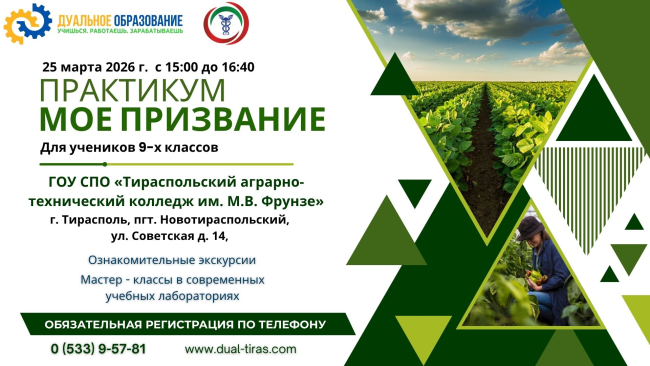 • 25 марта (15:00-16:40) Тираспольский аграрно-технический колледж им. М. В. Фрунзе – мастер-классы по специальностям «Агрономия» и «Мехатроника в отрасли сельского хозяйства».