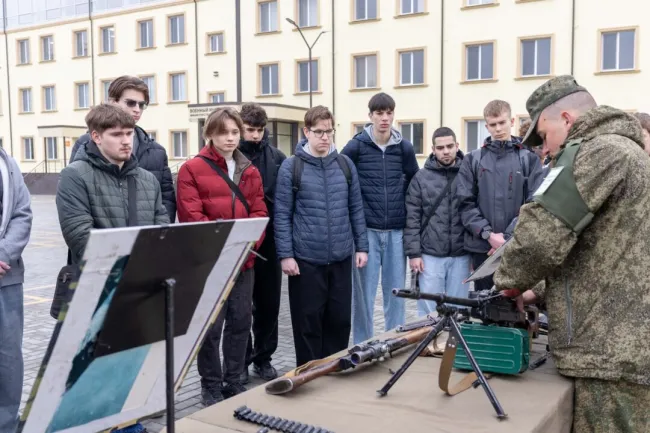 Однодневная выездная экскурсия началась с посещения военного института Минобороны. На плацу организовали учебные места, где были представлены макеты стрелкового вооружения.