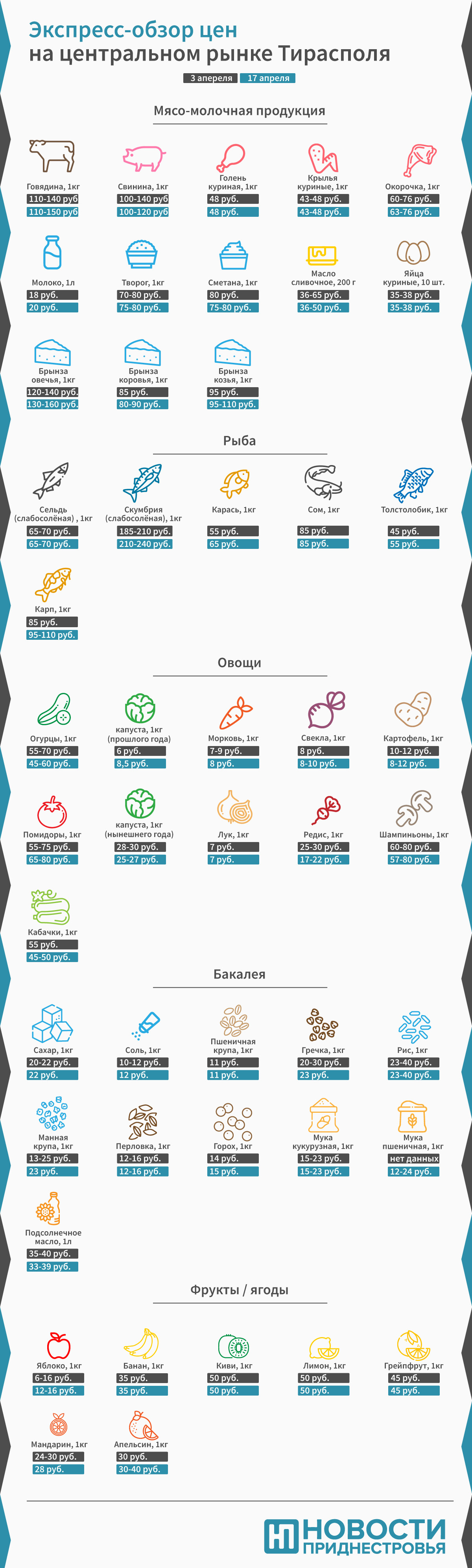 Тирасполь, 17 апреля. /Новости Приднестровья/. На Зелёном рынке Тирасполя подорожали живая рыба и слабосолёная скумбрия, говядина, а также молочная продукция. Немного подешевели свинина, молодая капуста, огурцы и редис. Подробнее о ценовых изменениях на продукты питания за минувшие две недели читайте в нашем обзоре.