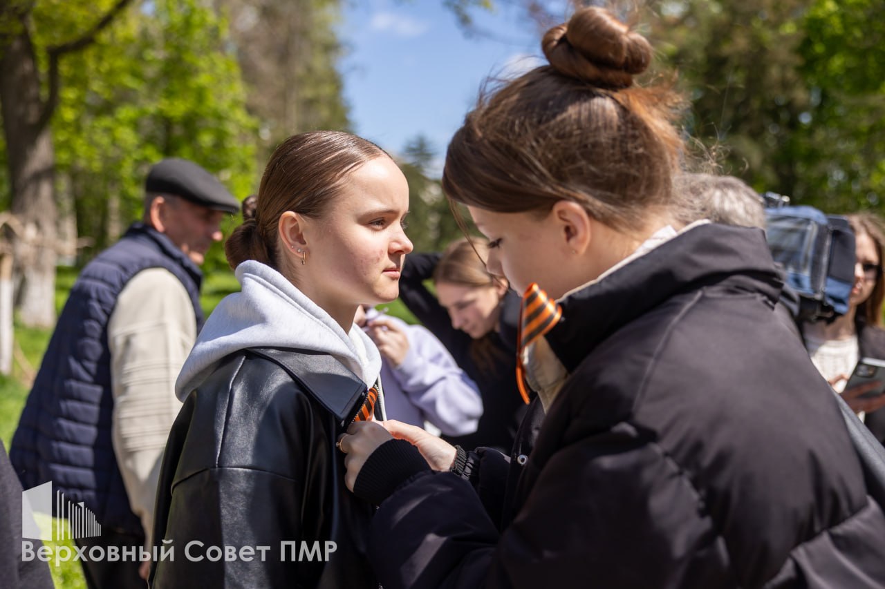 Тирасполь, 24 апреля. /Новости Приднестровья/. Акцию «Георгиевская ленточка» провели в посёлке Новотираспольском. Чёрно-оранжевые символы Победы получили студенты и сотрудники Аграрно-технического колледжа, а также вице-спикер парламента - председатель партии «Обновление» Галина Антюфеева, депутаты Елена Соболева и Наталия Дурбала, сообщает пресс-служба Верховного Совета.