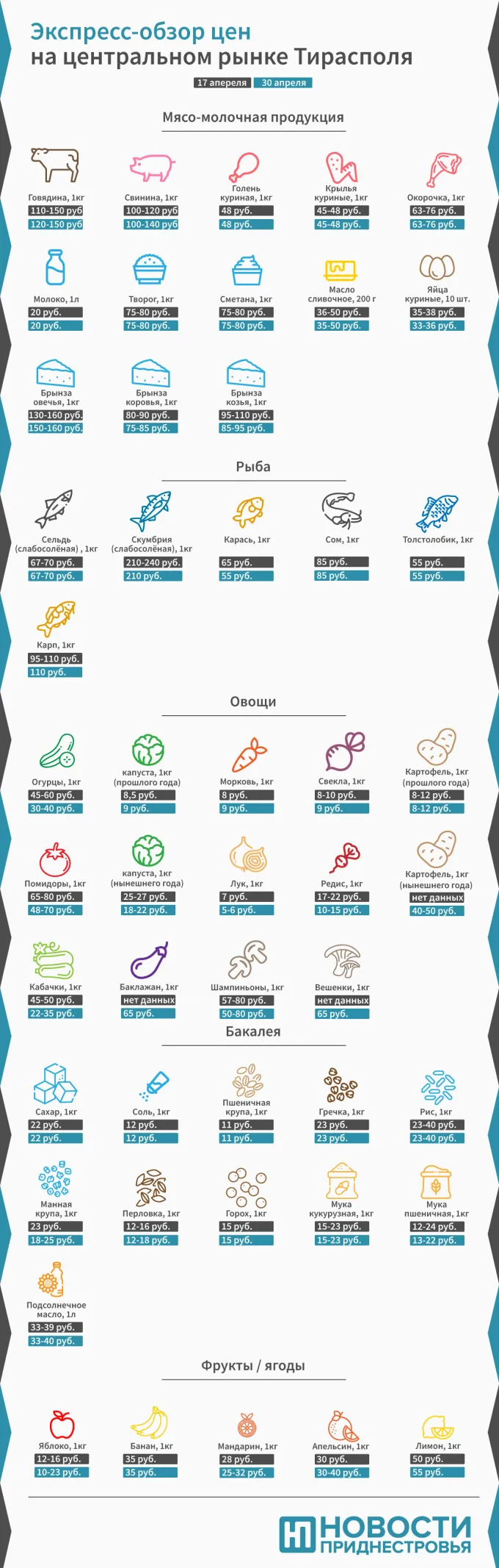 Тирасполь, 30 апреля. /Новости Приднестровья/. На Зелёном рынке Тирасполя подешевели овощи - огурцы, молодая капуста, помидоры, кабачки и редис, живой карась, а также брынза козья и коровья. А вот свинина подорожала. Подробнее о ценовых изменениях на продукты питания за минувшие две недели читайте в нашем обзоре.
