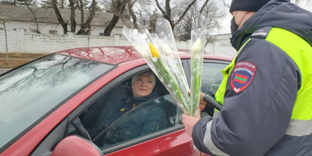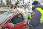 Сотрудники ГАИ вручают автоледи цветы и открытки